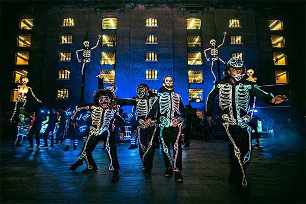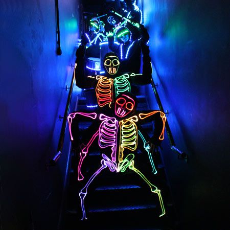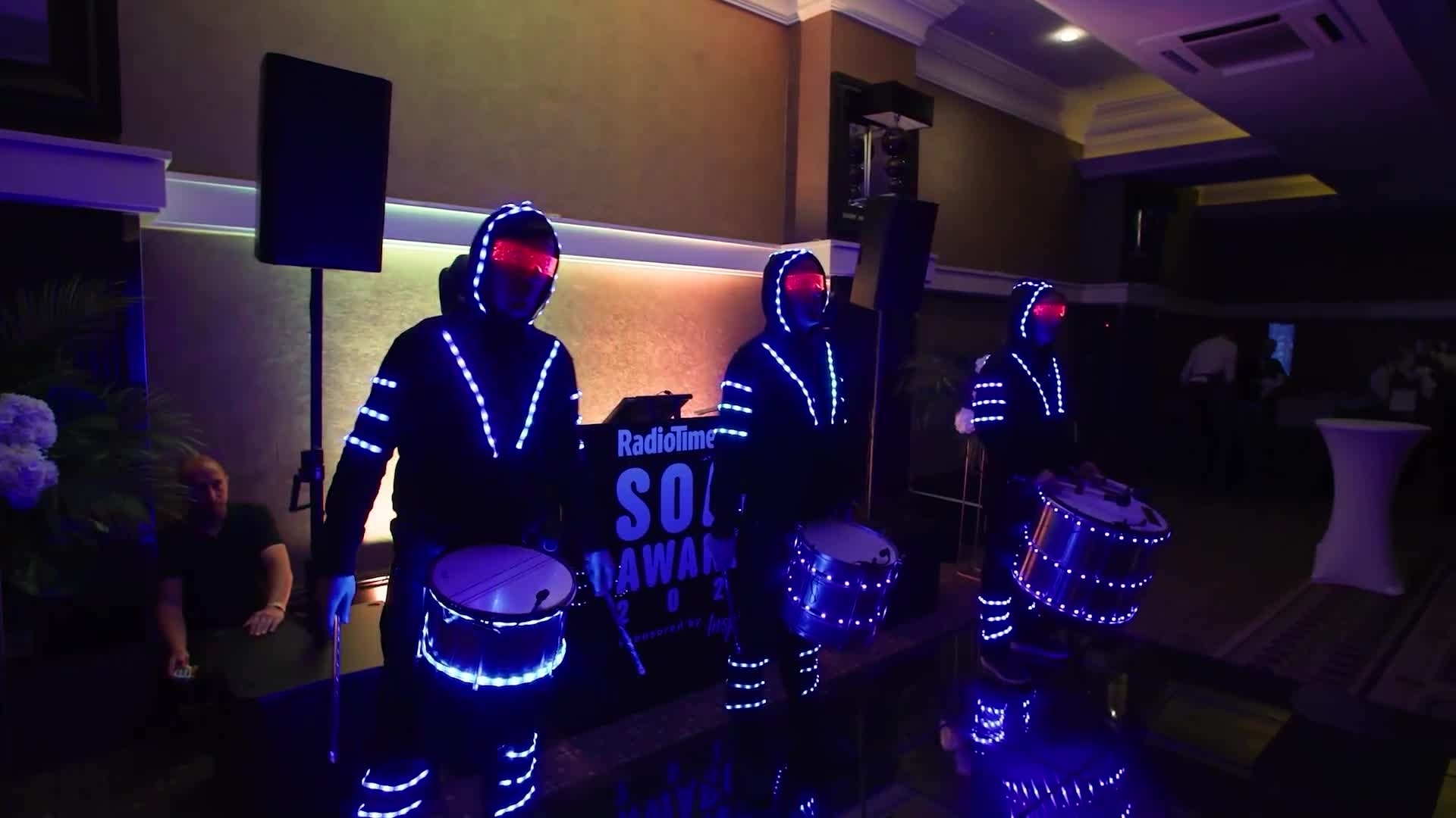 Able to walkabout at events or take centre stage, this vibrant mobile percussion troupe never fails to create a lively atmosphere at events. Performing in LED lit suits and using high tech equipment like smoke machines and black UV lights, you can also hire these amazing LED drummers alongside professional UV dancers. Why not book them for your brand reveal event? Our LED Drumming act can customise their suits so that the LED lights show a company logo or specific shape in a multitude of bright LED lights. The effect is amazing!