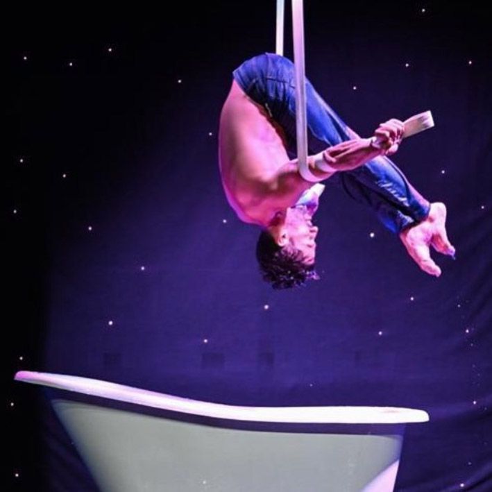 A unique aerial act that displays phenomenal control of his upper body strength using aerial straps and a flying bathtub!
