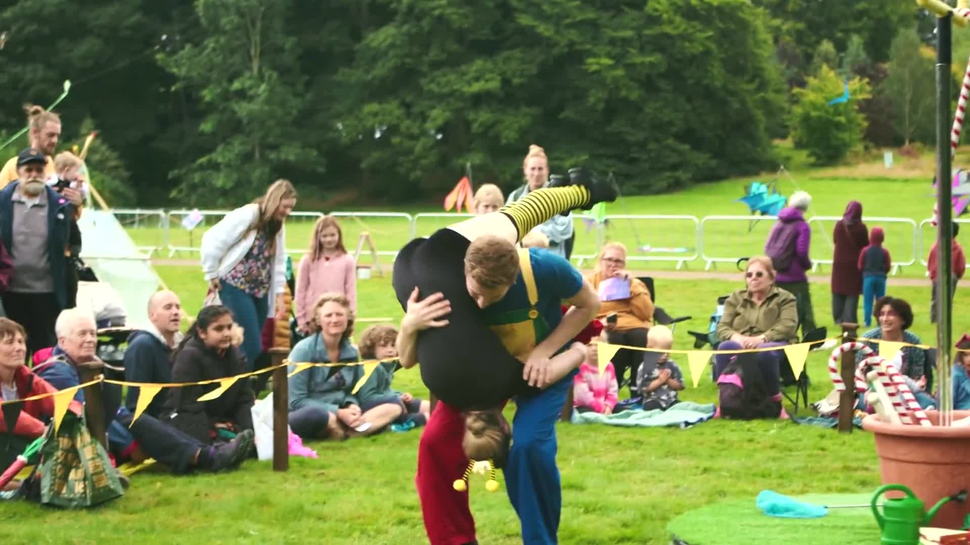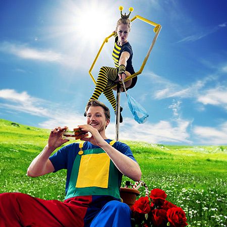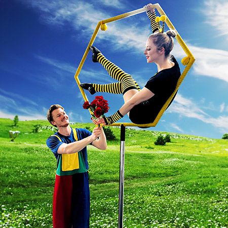 Experience the magic of friendship with our Bee Themed Aerial Show featuring hilarious clown antics and breathtaking acrobatics