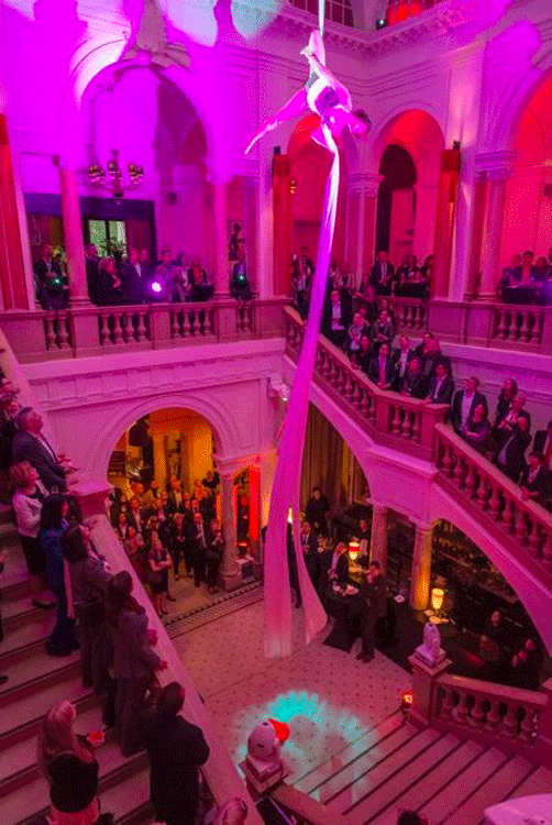 Guaranteed to have everyone looking to the sky our silk aerial performer dazzles and delights as she cascades from the ceiling fusing elegance with strength and musicality with superb flexibility. With a wealth of experience travelling around the world performing no event is too big or too small for our exceptional aerial performer as she guarantees superb ambient entertainment at every event.