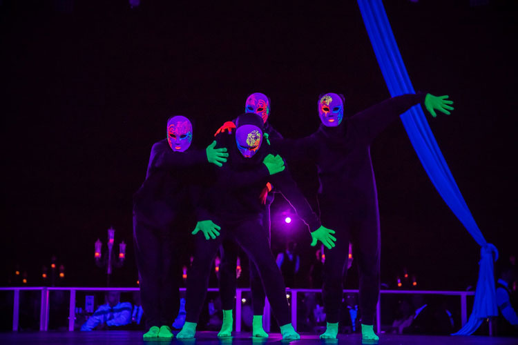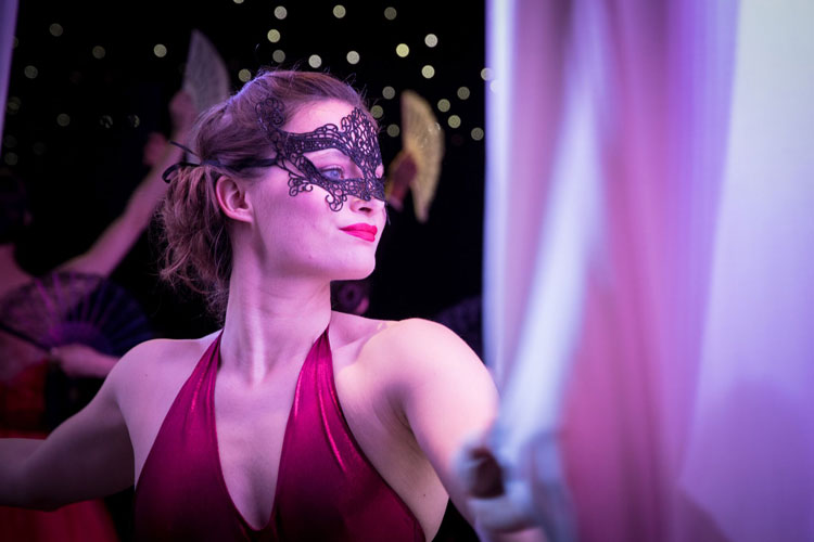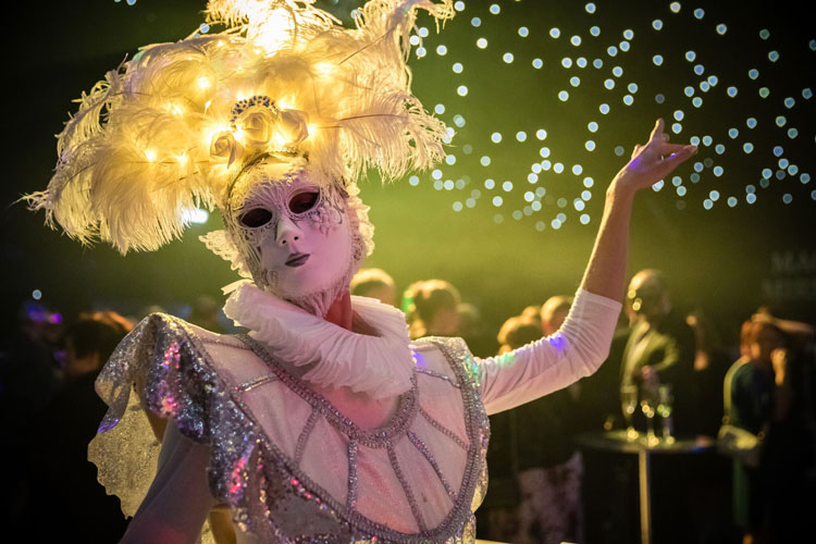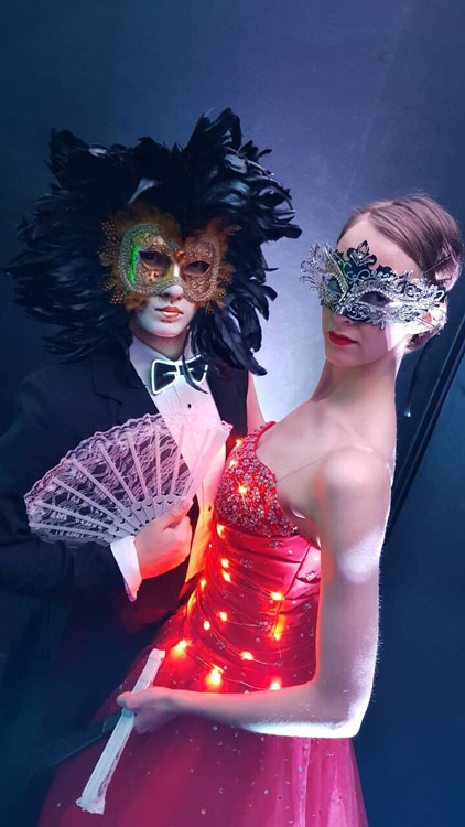 Glowing Masquerade - watch as characters in ball gowns, stunning masks and fans travel through your event interacting with guests on the way to the stage. When they arrive at the stage a beautiful waltz takes place with mesmerising choreography that wows all audiences as they give a nod towards the Andrew Lloyd Webber scene in Phantom.
