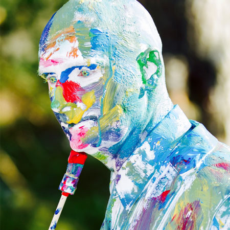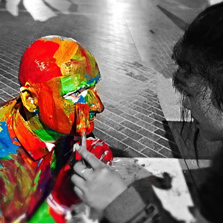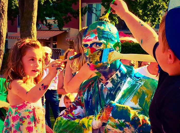 Are you looking for an interactive street performer to break the ice at your event? Our skilled roaming character offers a totally unique art themed entertainment option to evoke your guests’ creative sides. Twice awarded the most prestigious accolade for walkabout entertainers, "World Champion of Living Statues”, this is one of our artist’s most individual acts. Arriving at your venue in the guise of a ‘blank canvas’ our human doll is the perfect surface for letting loose and bringing a splash of colour to your day.