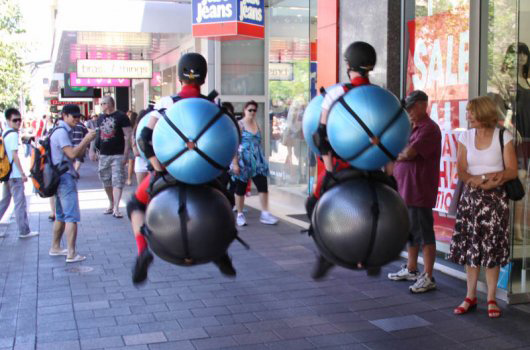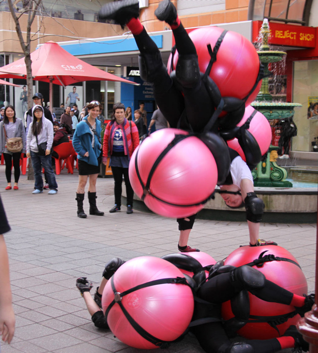 The bouncing ball acrobats first started in 2001 in South Australia and have since performed and toured on a regular basis. They have performed in Europe, Japan, and Singapore as well as throughout Australia and featured at major sporting events, international Arts Festivals, Corporate events, family events and shows.