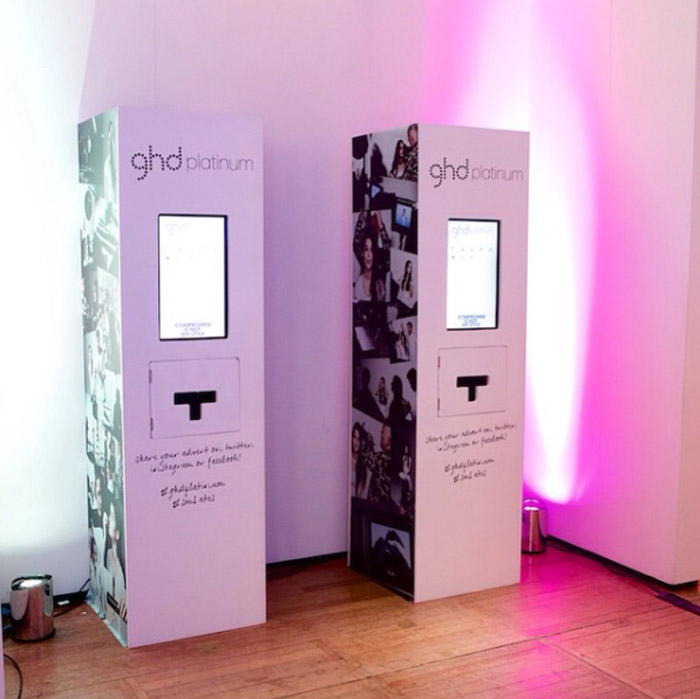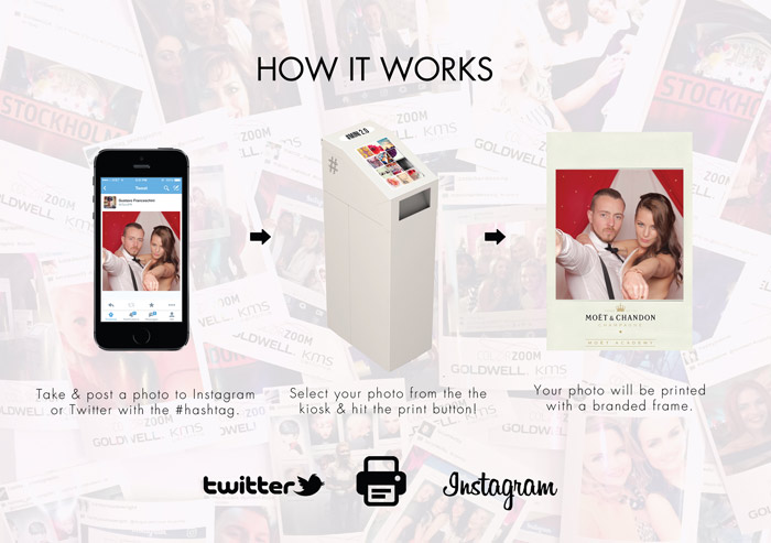 The customisable photo booths are a blank canvas ready to be branded for a specific event or by a particular client. They are fully social media integrated and users are able to share images directly to Facebook, Twitter and Pinterest as well as sharing by text or email and print it off immediately with a branded template.