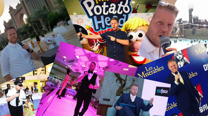 The British MC in Dubai's training, skills and craft set guarantee that his performance will be of top quality. He has previously appeared at Mohammed Bin Zayed International Robotics Challenge, Dubai Emirates Airline Rugby 7s, Mall of Emirates, Sahara Centre, Times Square Centre, Yas Waterworld, Ferrari World, IMG Worlds of Adventure, Atlantis The Palm, Jumeirah Zabeel Saray The Palm.