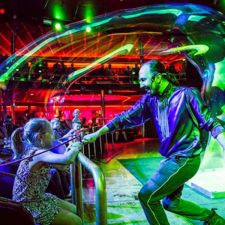 Featuring giant bubbles, close up bubbles, bubble towers, bubbles in incredible shapes, smoke bubbles, and even people inside of bubbles, this is not a show to be missed, and will certainly amaze guests at your event.