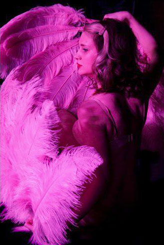 Pretty in pink, this is a quinteseential hide-and-reveal style feather fan dance. Soft, pretty, and very sparkly act