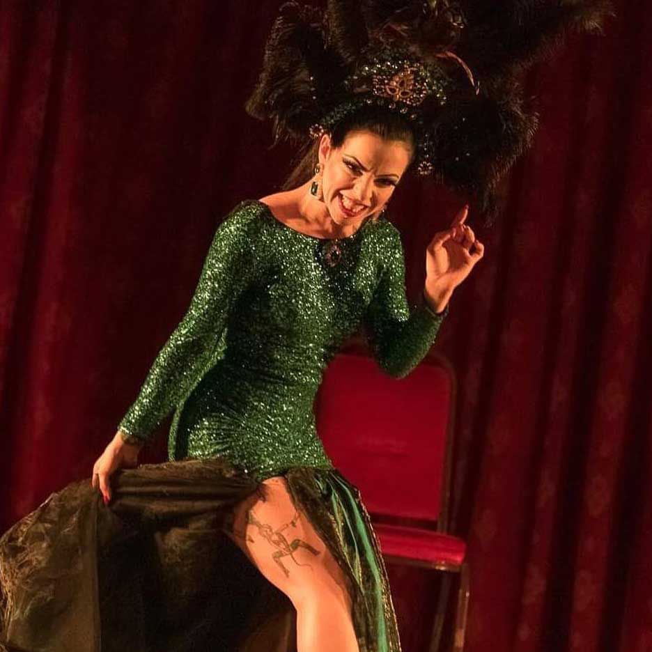 Our burlesque dancer has performed all over the world appearing at many Burlesque festivals and can include aerial acrobats in her shows