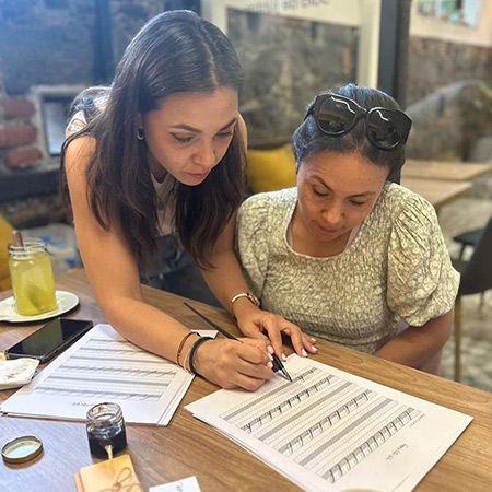 In addition to live event calligraphy and engraving, our artist offers calligraphy workshops at events, sharing her skills with the audience