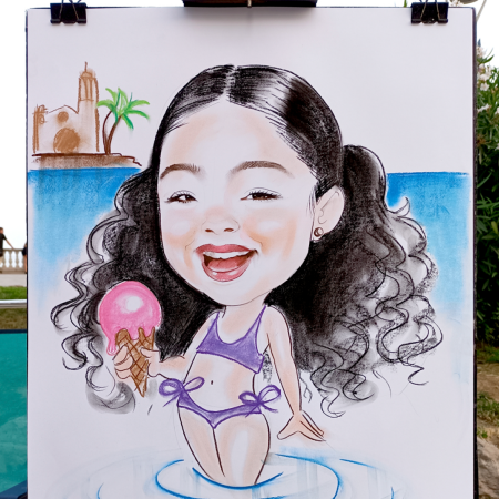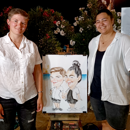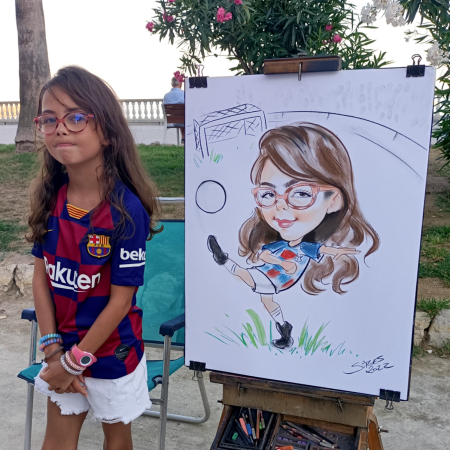 Simoultaneosly, Ina has been working since 2008 doing caricatures and portraits, both in Alicante and in Sitges (Barcelona). Her caricature style is funny and restrained at the same time, not distorting the facial features too much, which guarantees the resemblance to the model.