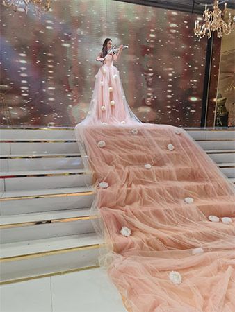 Our glamorous cascading dress violinist will wow your event guests in her gorgeous, cascading 20ft long gown