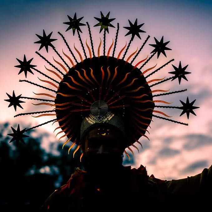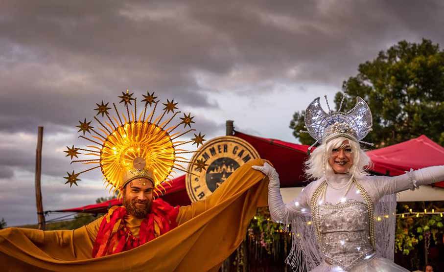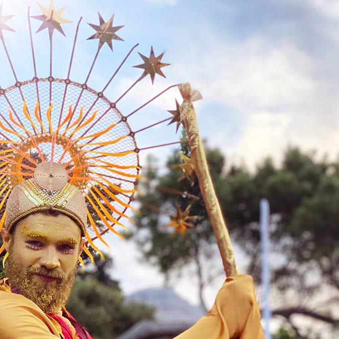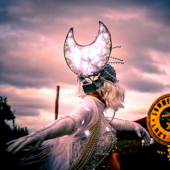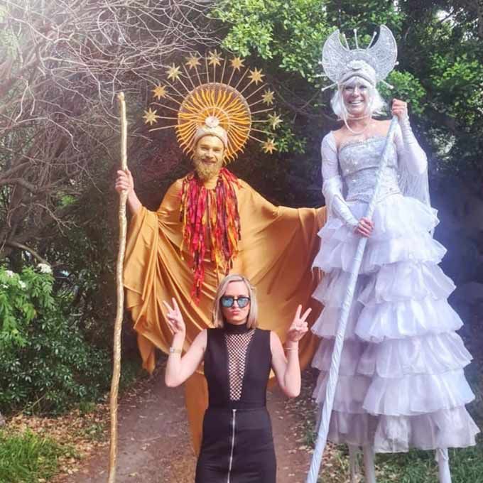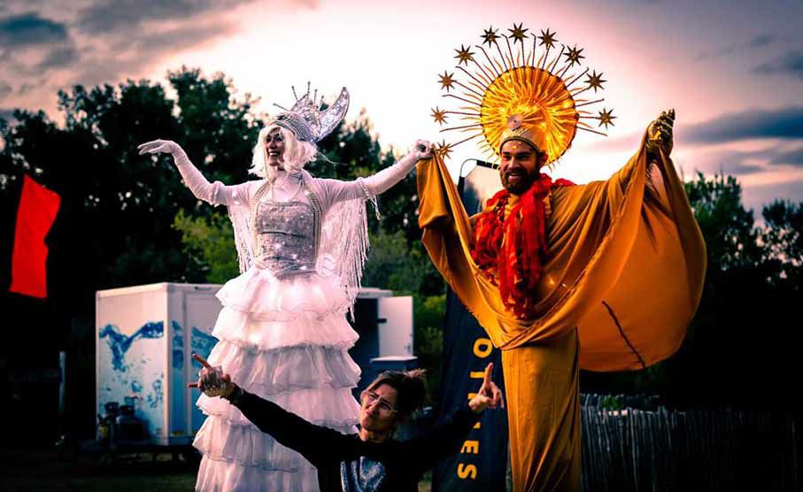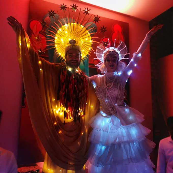 Our eye-catching stilt duo are an elegant site in their beautiful sun- and moon-inspired costumes that glow ethereally thanks to their built-in LEDs