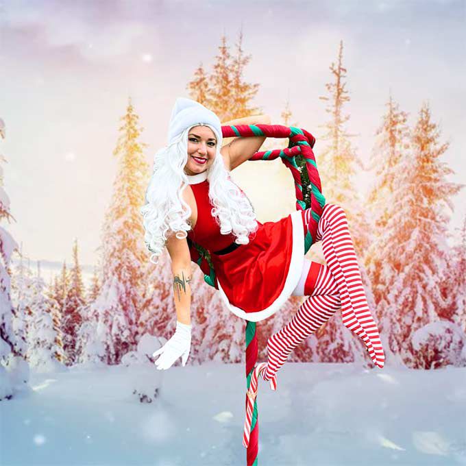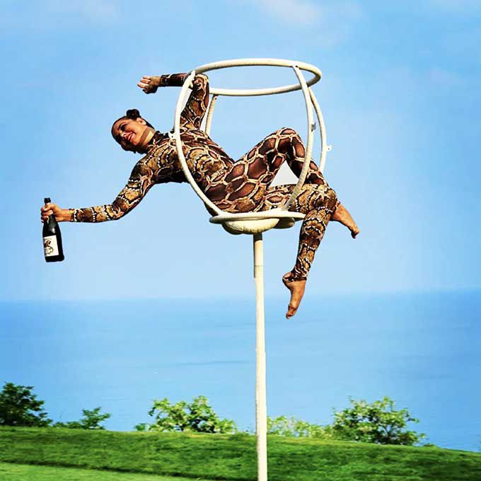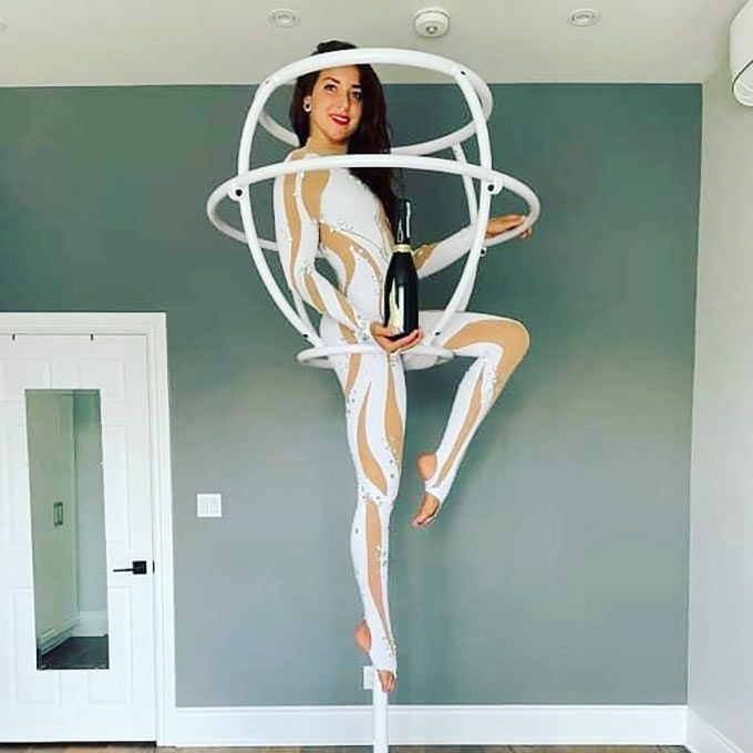 She performs from a freestanding rig shaped like a champagne glass, for an easy-to-set-up aerial solution that is perfect for venues without rigging