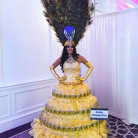 With intricate designs and concepts our themed champagne dresses really are a spectacle to behold as they are fully customised to complement your event in an extravagant yet subtle manner. Guaranteed to turn heads and get your guests talking watch as our champagne girls glide around, serving champagne to all who want it. A perfect combination of glamour, elegance and creativity, our strolling champagne dresses are the perfect addition to any occasion.