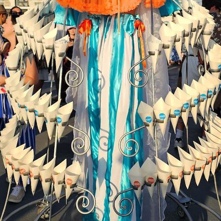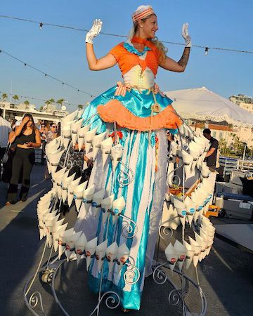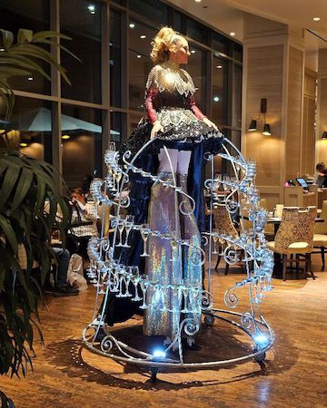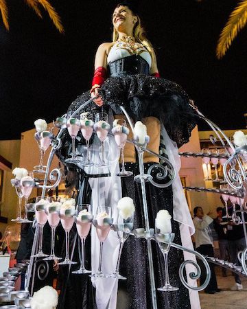 This roaming stilt walker presents glasses at the ideal height, allowing guests to easily help themselves from the elegant champagne skirt