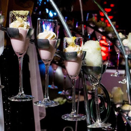 The skirt can hold up to 100 glasses or cones, suitable for champagne flutes, desserts, popcorn cones, and a variety of snacks or beverages