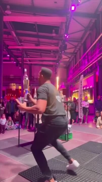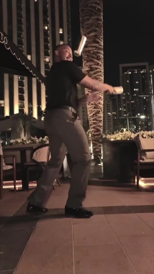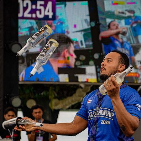 His performances feature impressive tricks, from juggling multiple bottles (even blindfolded) to fire juggling and balancing bar utensils