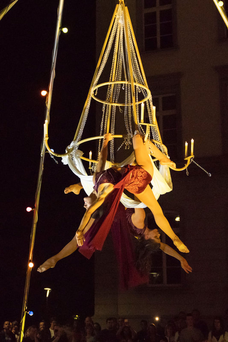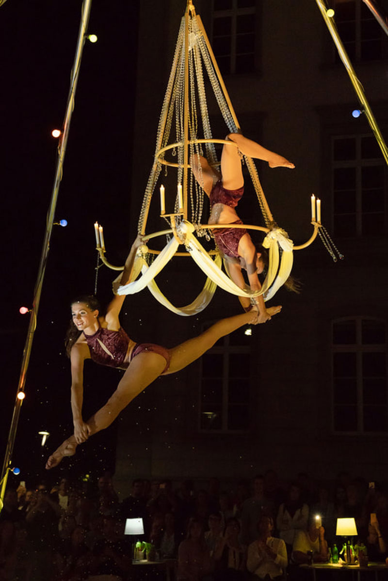 The perfect acrobatic performance for both indoor and outdoor venues, our aerialist duo has previously produced an unforgettable bespoke performance for the opening ceremony for the Schulhausplatz Baden. An ideal circus entertainment act for both festivals, clubs, private parties and high-end corporate events, galas and product launches.