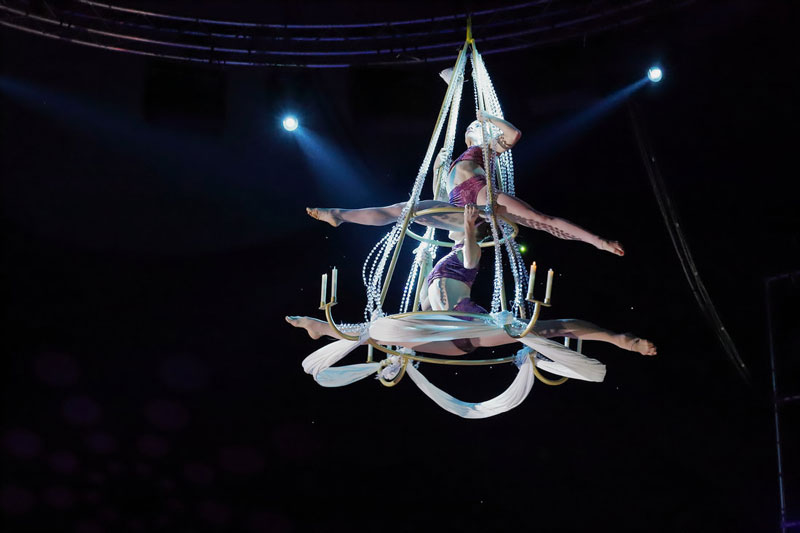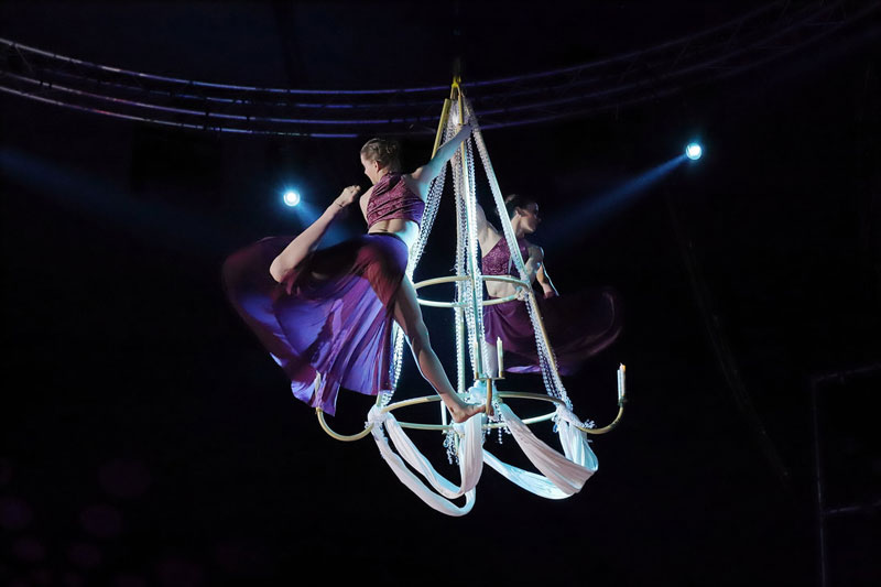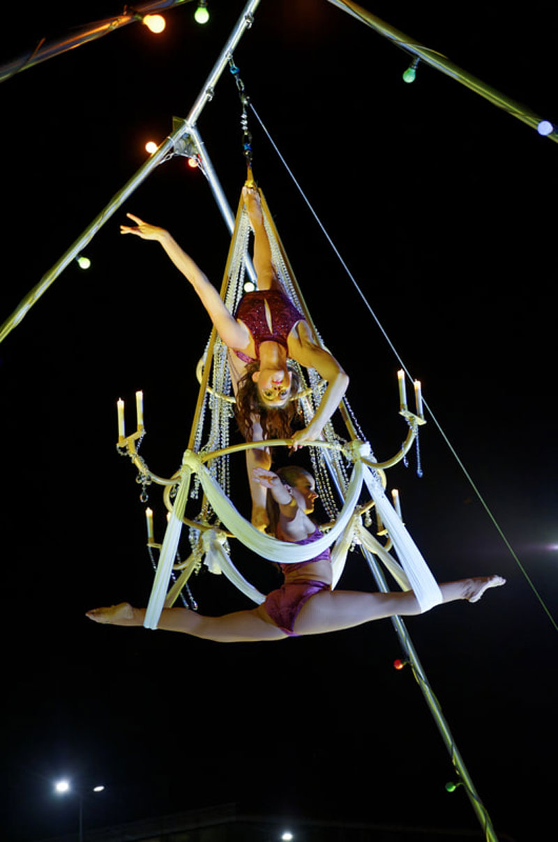 Looking for a completely unique aerial act? Then our Chandelier Duo Switzerland is the circus entertainment act for you. An aerialist duo who combine astonishing acts of strength and daring into intricate hanging chandelier performances. across any stage, event or function.