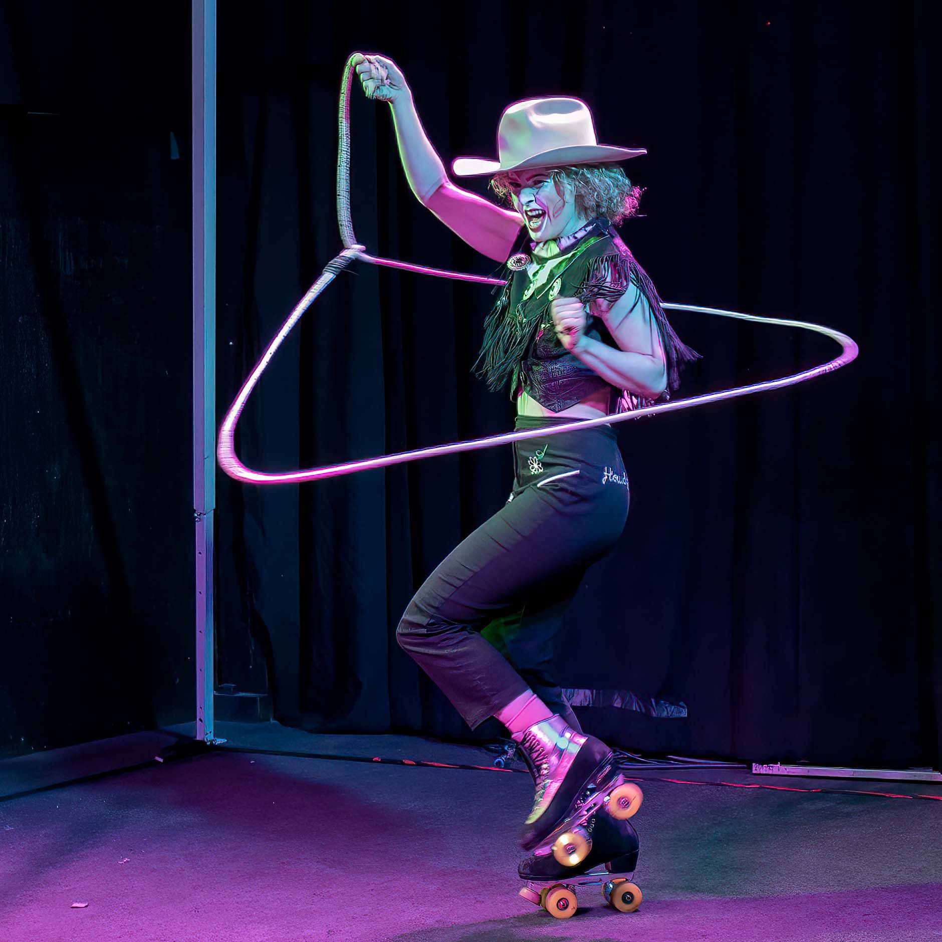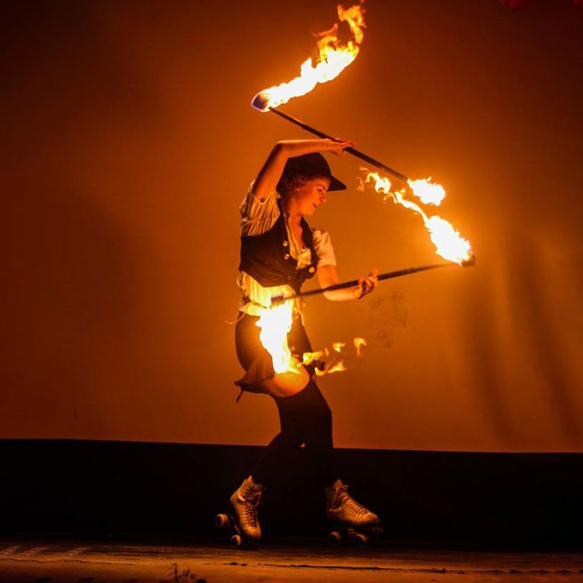 Our rollerskating juggler is proficient in knife juggling, lasso and fire including baton, umbrella, fans, and triads - a unique show experience