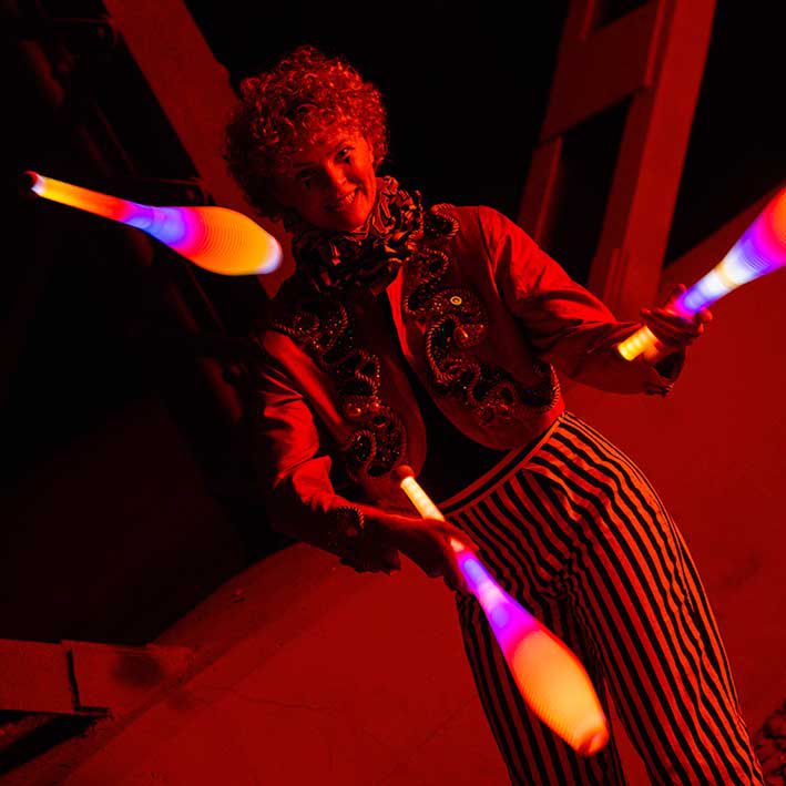 For lowlight, she can offer LED rollerskates and LED juggling options; our multiskilled cirque artists can also offer stilt walking.