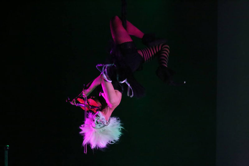 Combining a whole host of diversely talented circus performers, our acrobat troupe is made up from a fire-breathing violinist, opera singers trained in circus entertainment, and up to 12 acrobats whose skills include contortion, aerial silks, trapeze, floor acrobatics, and aerial hoop.