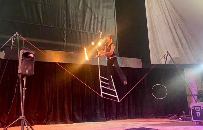 His dynamic stage productions incorporate a variety of skills including juggling, fire acts, rope-walking and hilarious audience participation