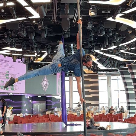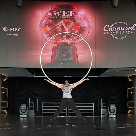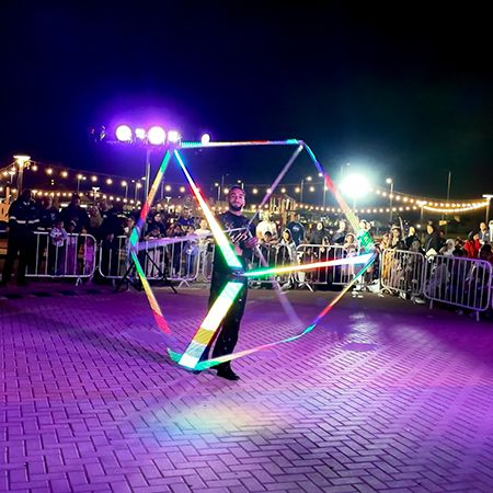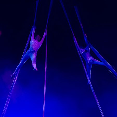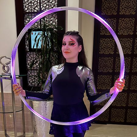 The female cirque artist offers aerial silks, straps and aerial net, lollipop and LED hula hoops. She also offers duo agadio shows