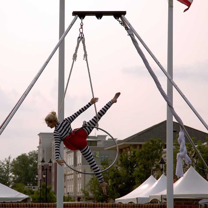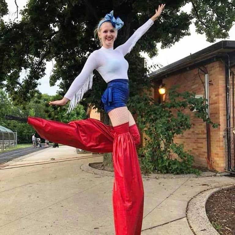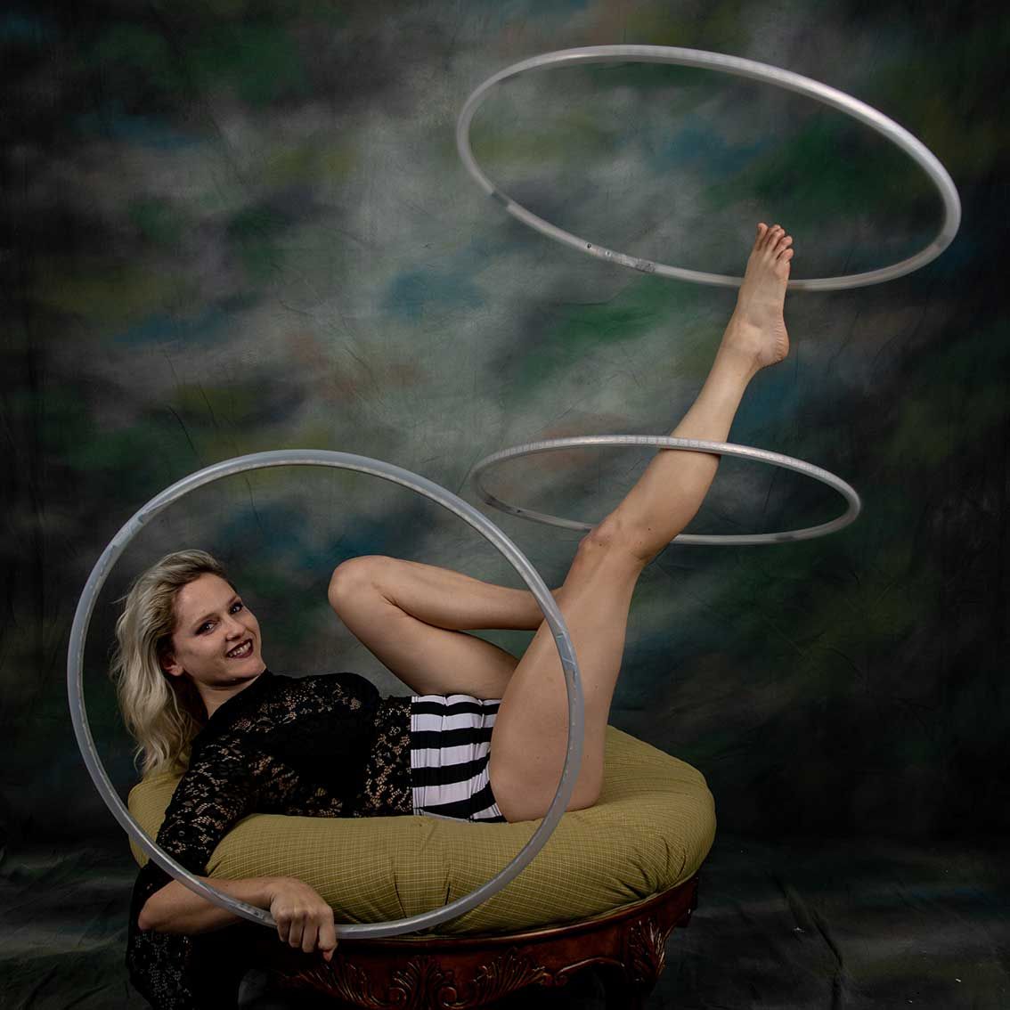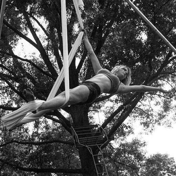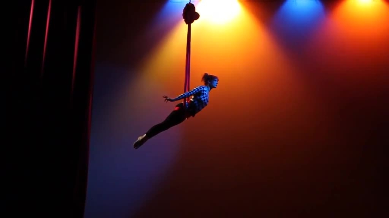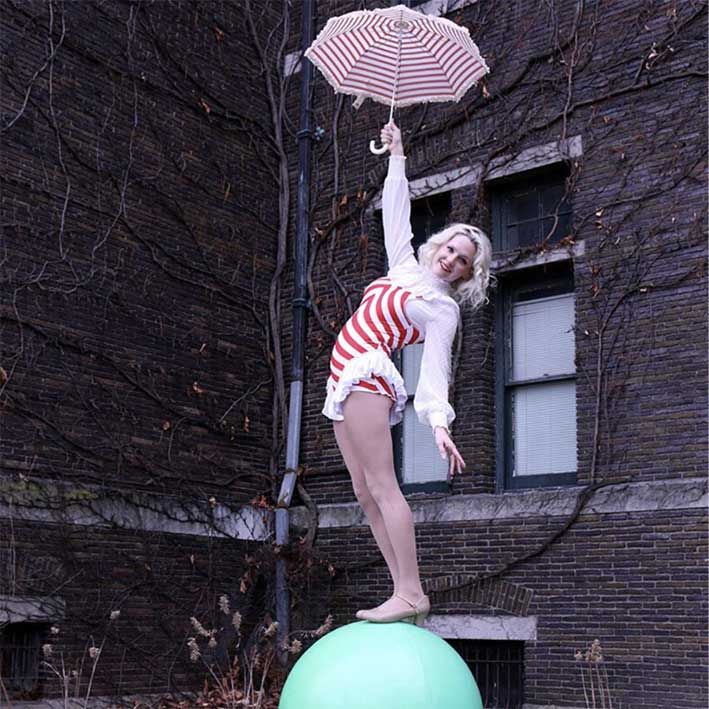 Her aerial acrobatic routines include trapeze, silks, lollipop Lyra, hammock, net, chains and rope; she can take to the air for aerial bartending