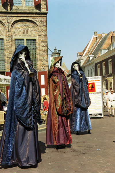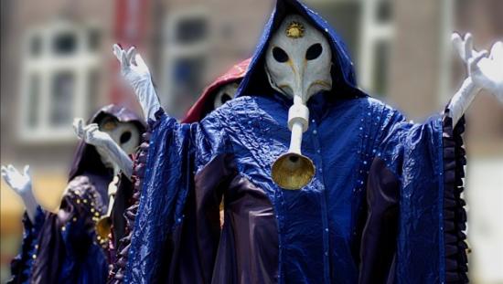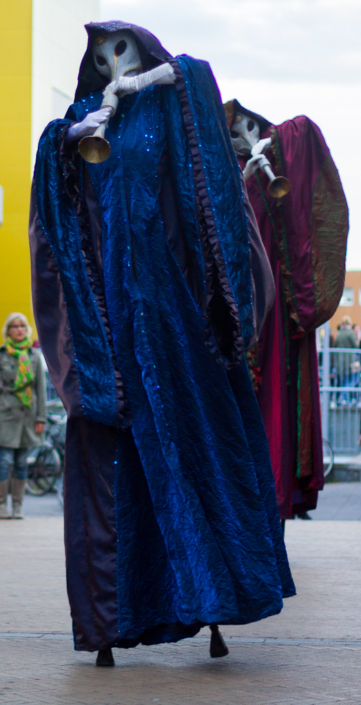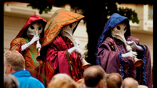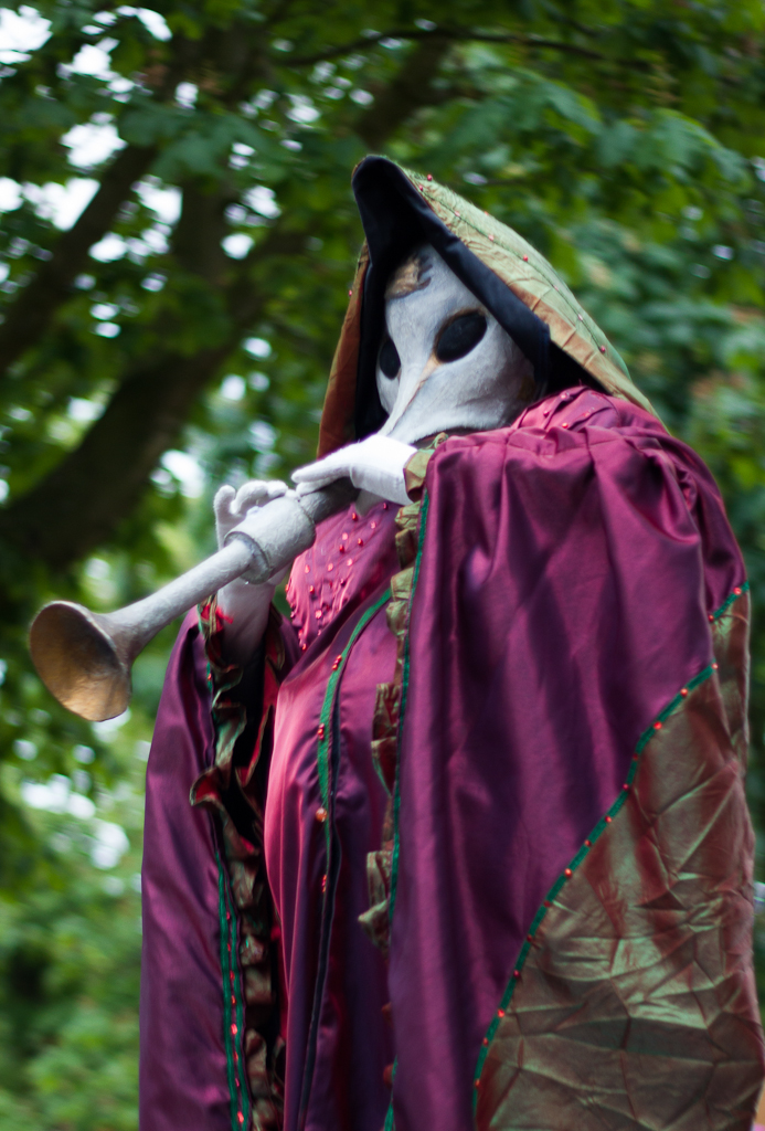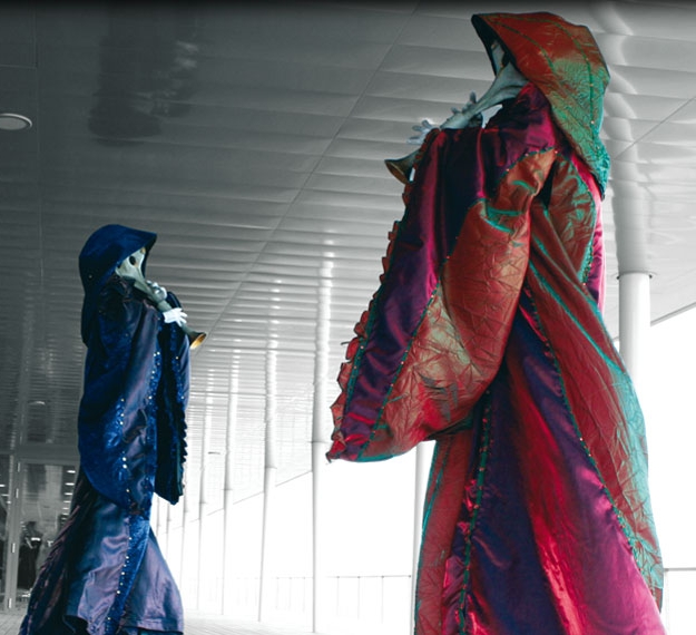 Eye-catching and unique, their elaborate colourful gown costumes and trumpet like masks will draw spectators to these unusual tranquil beings. Their incredible musicality will delight and fascinate audiences of all ages and create a serene ambiance for all to enjoy. These wonderful creatures also have a cheeky sense of humour that will delight audiences of all ages!