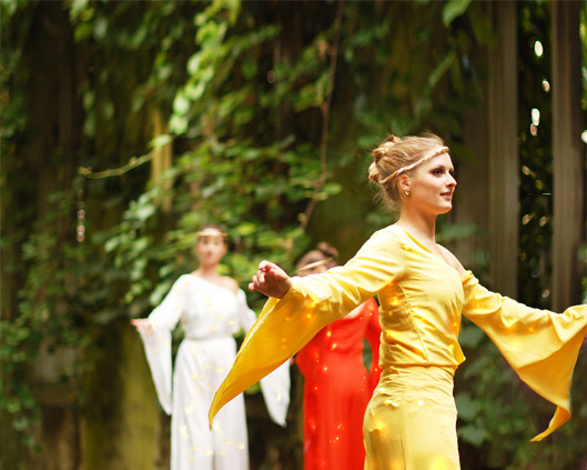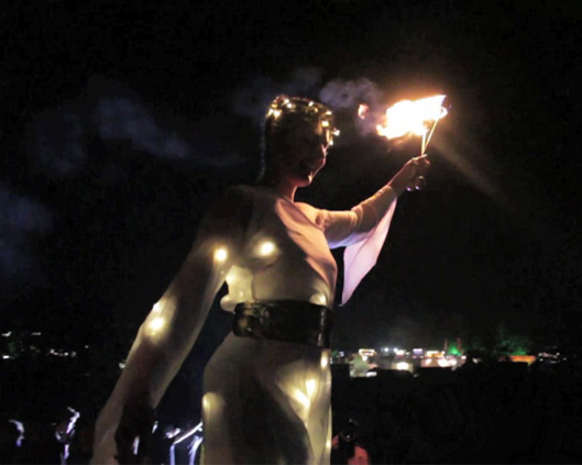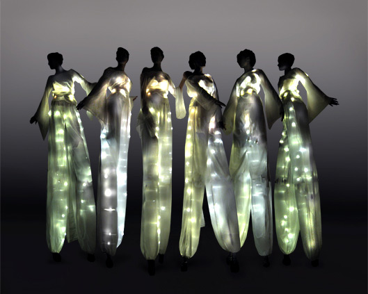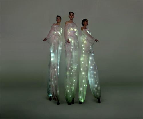 Colour Stilt Walkers portray a utopian vision; dressed in the simplest flowing fabric and plaited gold, and glow with shimmering light.
