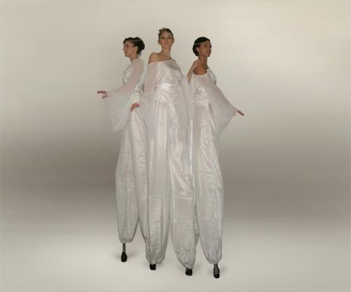 This choreographic repertoire also allows the stilt walkers to perform stage shows, either as pure dance or with props. They are ethereal characters and tend not to have long conversations with guests, but can interact by simple bowing, greeting and guiding.
