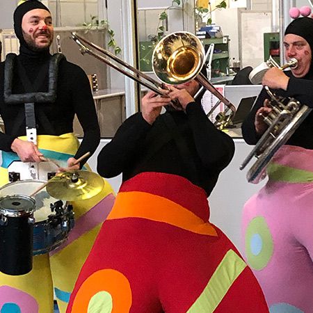 This multi-faceted walkabout band has a variety of costumes available so they can adapt to many event themes and colour schemes