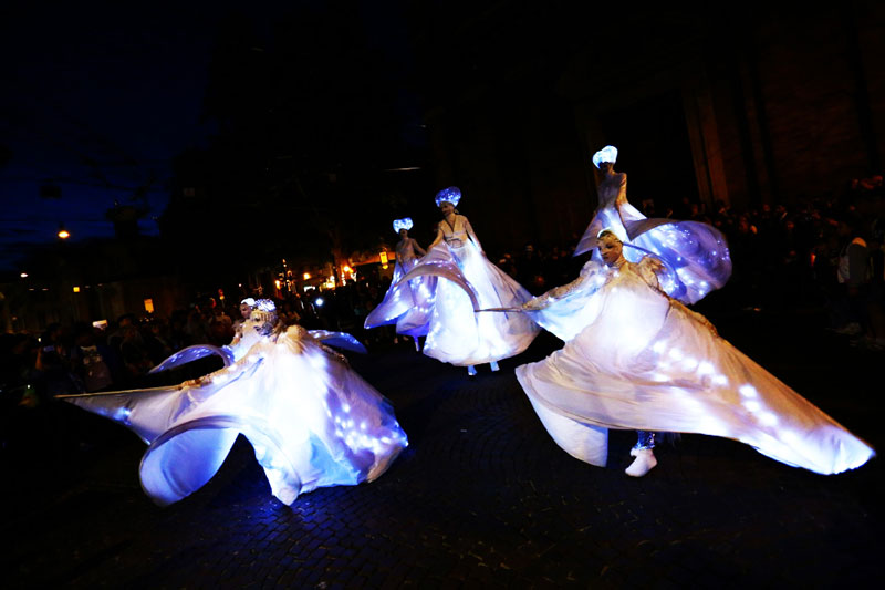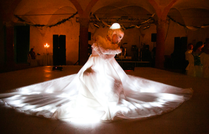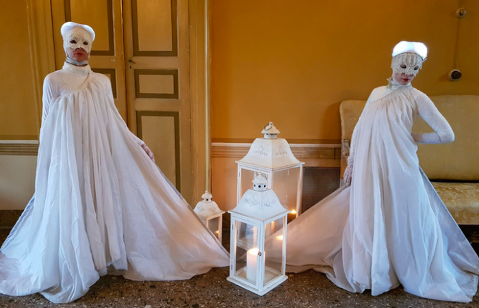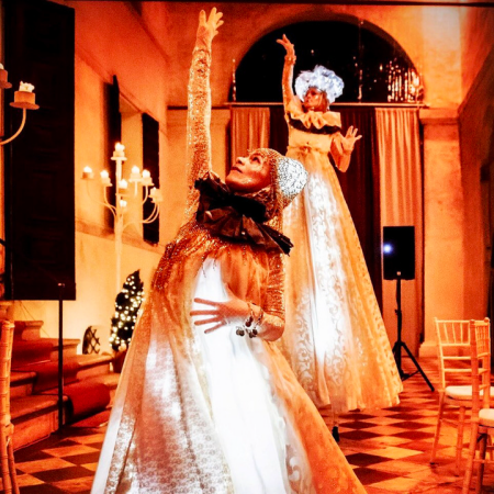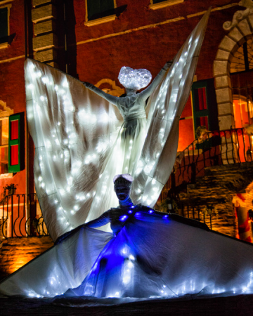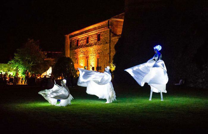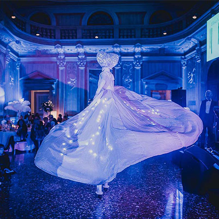 Themed walkabout entertainment can fit a variety of occasions. These white walkaround performers in particular are especially suitable for white themed parties, Christmas parties, weddings and other evening celebrations where they can shine bright.