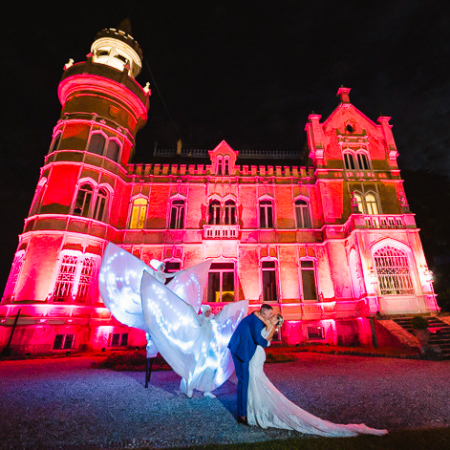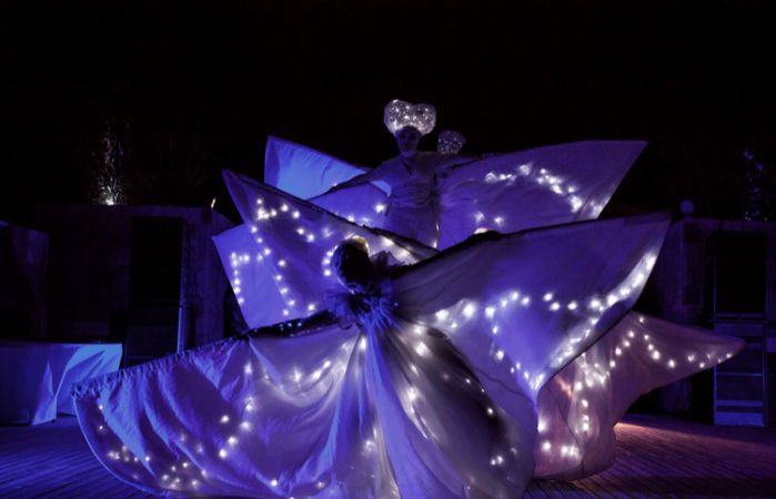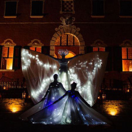 For greater visual impact, this visually stunning walkabout act must be preferably performed under full darkness. Our winged roaming performers also offer stage shows. Their poetic choreographies will immerse viewers in a magical world of light and fantasy as they create a dreamlike atmosphere with their magnificent costumes and LED wings. Their stage shows can be complemented with live music and also LED walls or projections.