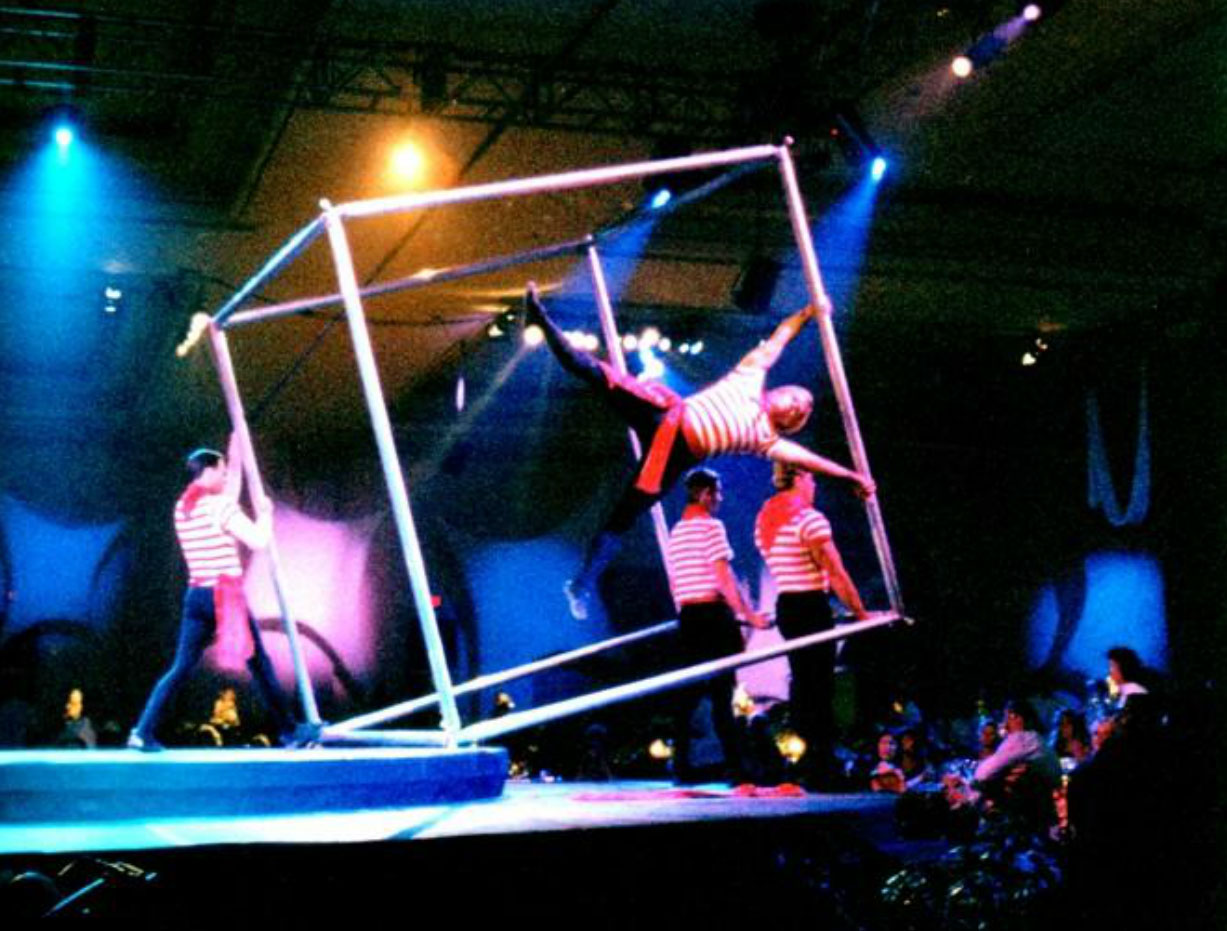 The Cube Act is an original creation of Steve Gale. The Cube Act is free from external rigging which makes for a smooth transition on and off stage. The Cube has an outside dimension of 8’ x 8’ x 8’ giving a huge presence as it is manipulated around the entire stage. While weighing only 85 pounds it is easily moved on and off stage. In recent years Cirque Du Soleil has adopted this act into their corporate entertainment department.