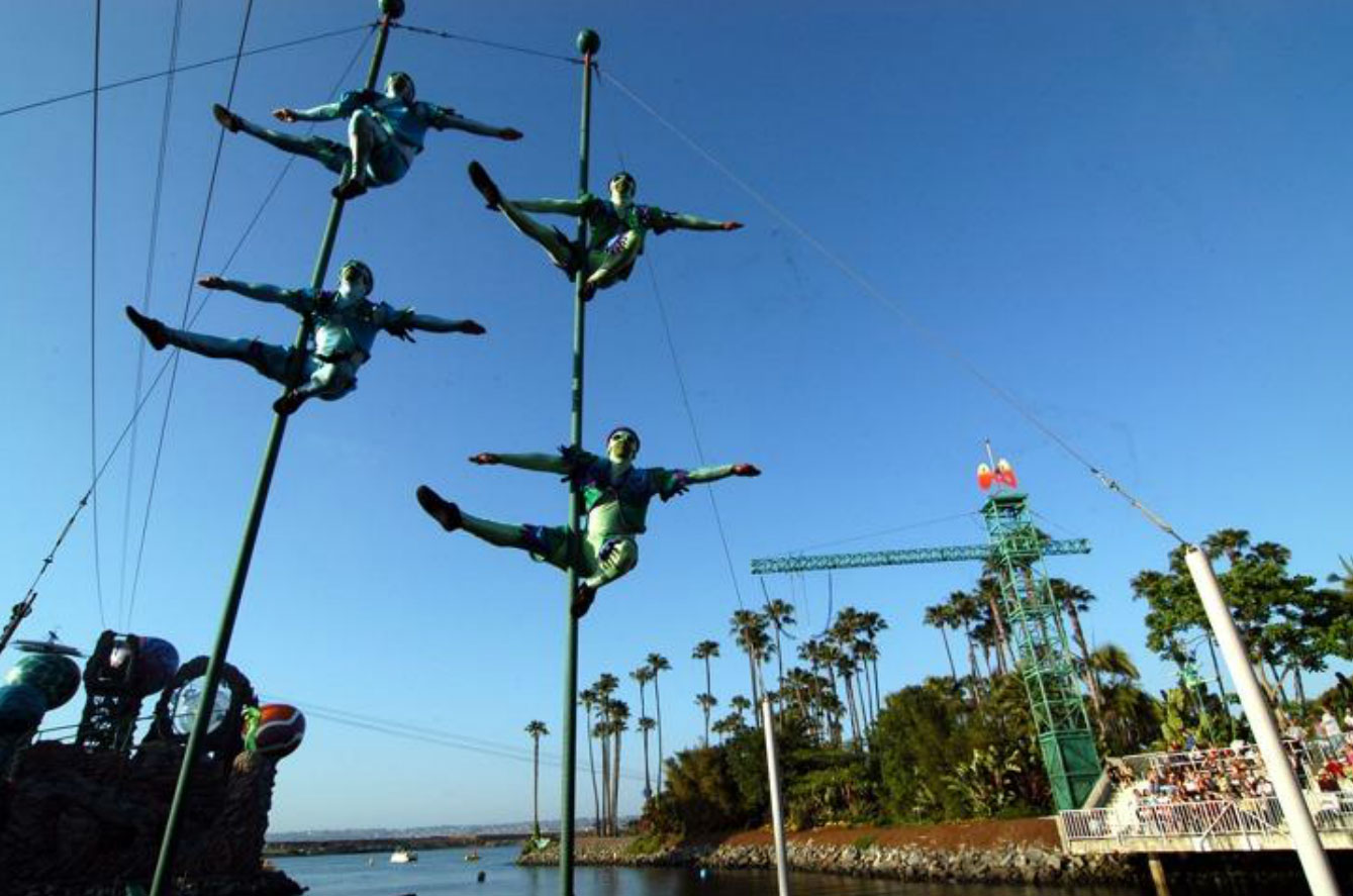 The traditional Pole Act consists of a single or multiple poles where the pole has a height of 15-21 feet or 5-6 meters and is guided down with cables. This act differs from the Cube Act in it's ability to have the performers jump from one pole to the other, and also has vertical drops and slides which adds an element of danger.
