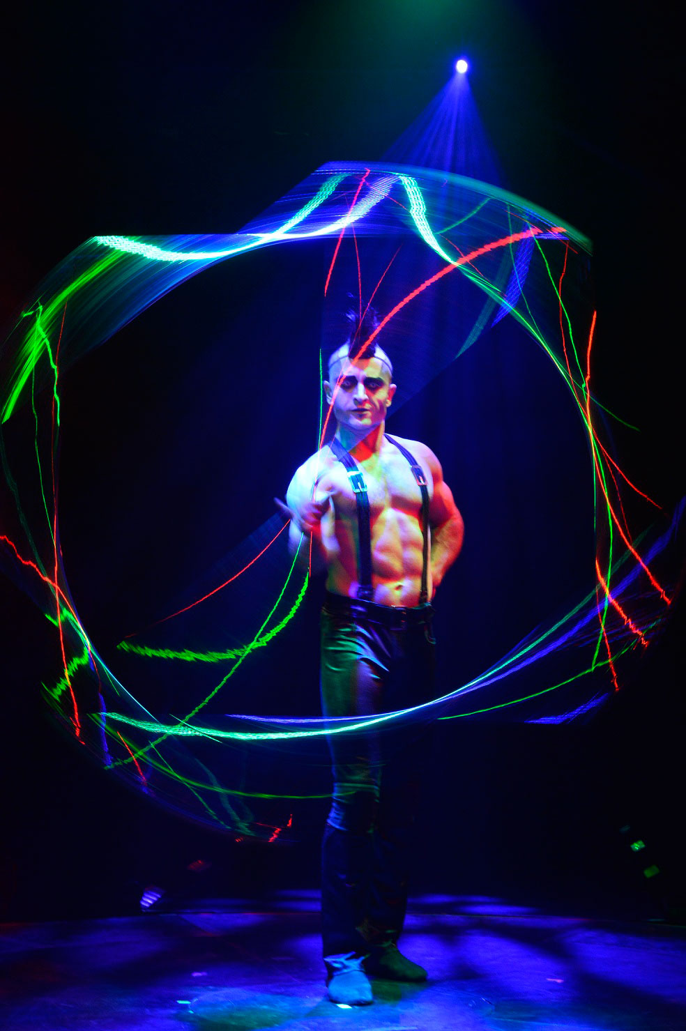 They spin in a way that reflects light which makes them seem unreal. Years of continuous training, inventing and creating resulted in this act that combines sensational effects and precision handling of these unusual transforming props. It is something that you have to see to believe!