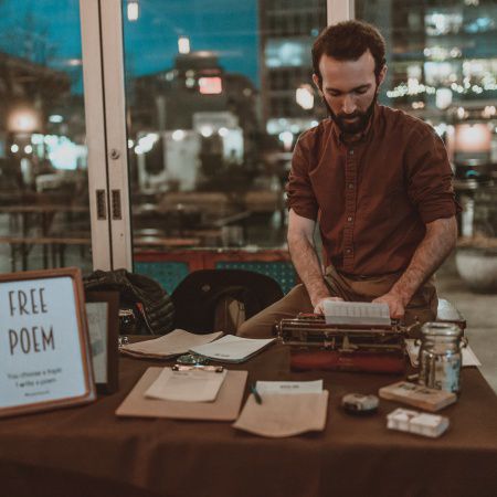 He can set up practically anywhere and customise his act to your needs thanks to his portable manual typewriter and years of performance experience