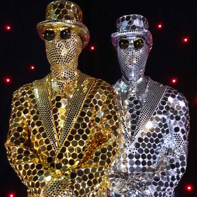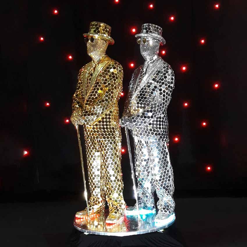 One-of-a-kind mirror men that is sure to amaze your guests that are dressed in gold and silver suits