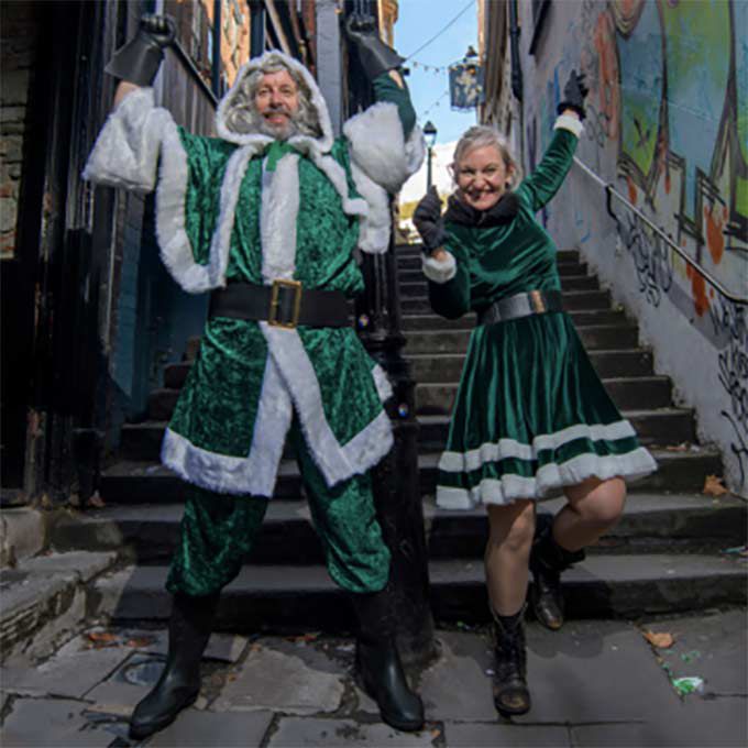 They reinvent the Claus family into modern role models for today’s society with a walkabout act that includes banging tunes and a positive message