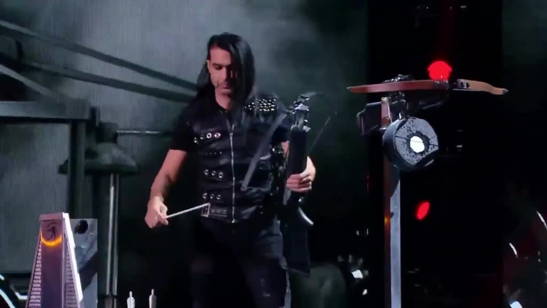 Watch in awe as he fires bolts at objects held by anĀ aerialist as she spins on a hoop