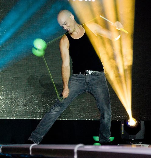 Props include diabolos, crystal contact balls, fireworks, contact hoops