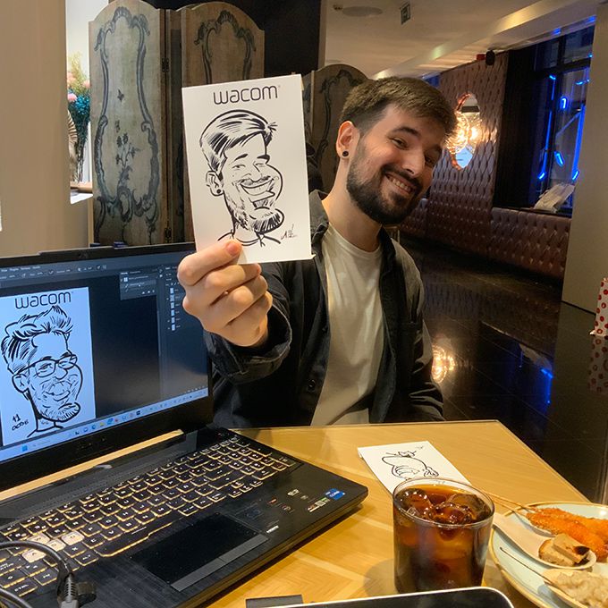 A friendly wedding and corporate event caricaturist, this illustrator quickly engages with people and makes them feel comfortable whilst they pose for him. Equipped with a tablet, a big monitor to display his illustrations and a printer, our iPad caricature artist can instantly print his drawings. They can be branded with your logo, branded image, the name of your company, a website, a date, etc.
