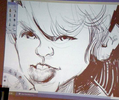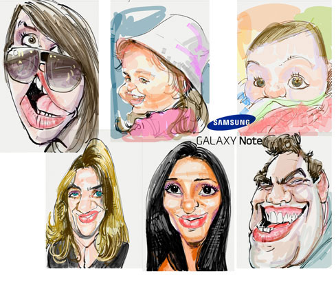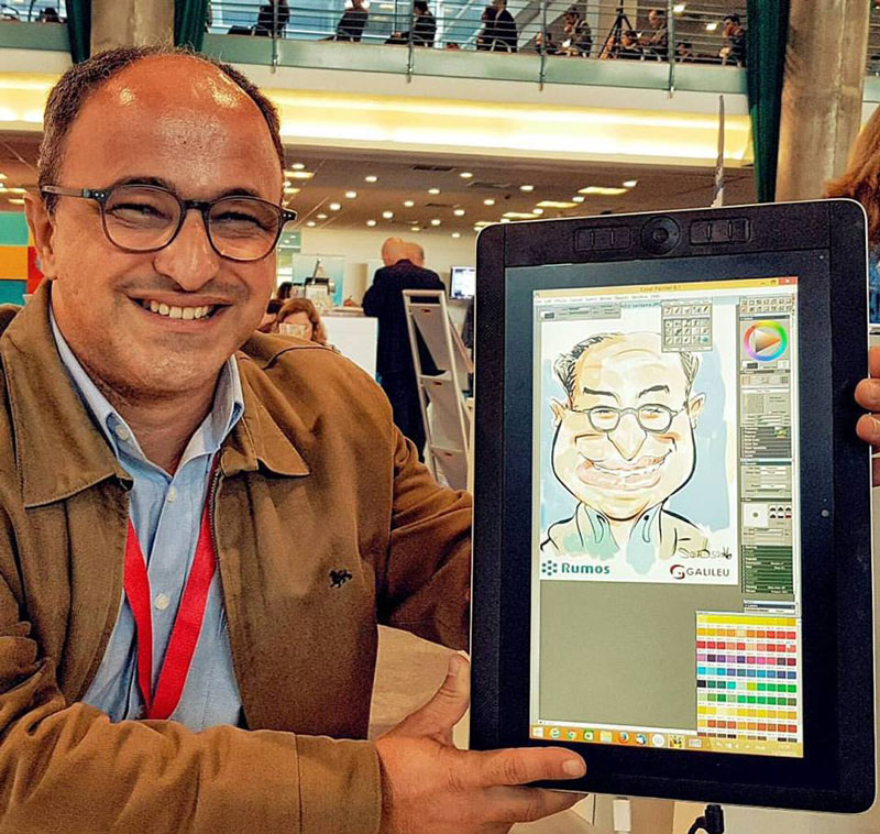 Our live event artist feels comfortable working surrounded by people. He enjoys sharing his work and even sharing some ideas with his audience. He can draw live digital caricatures on tablets and computers, so whatever the occasion, he can switch and use the technology that best fits your event. On top of that, his creative process can be witness by everybody around him as it can be broadcasted on a large screen if necessary.