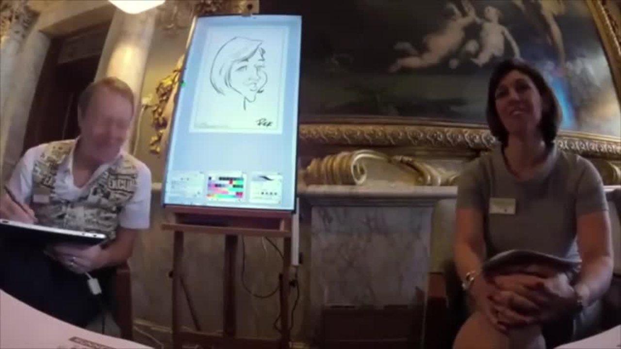 If entertaining one person at a time is not enough for your event Rick also draws colour digital caricatures on a tablet computer linked to big screens to entertain all your guests at the same time. Rick's caricatures can then be viewed working on any number of screens throughout the venue. This provides entertainment for a large audience. This was used to great effect at the Labour Party Conference where he drew many politicians and Cherie Blair.