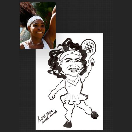 Her artwork highlights each individual’s features, offering both professional and humorous styles with options in colour or classic black and white