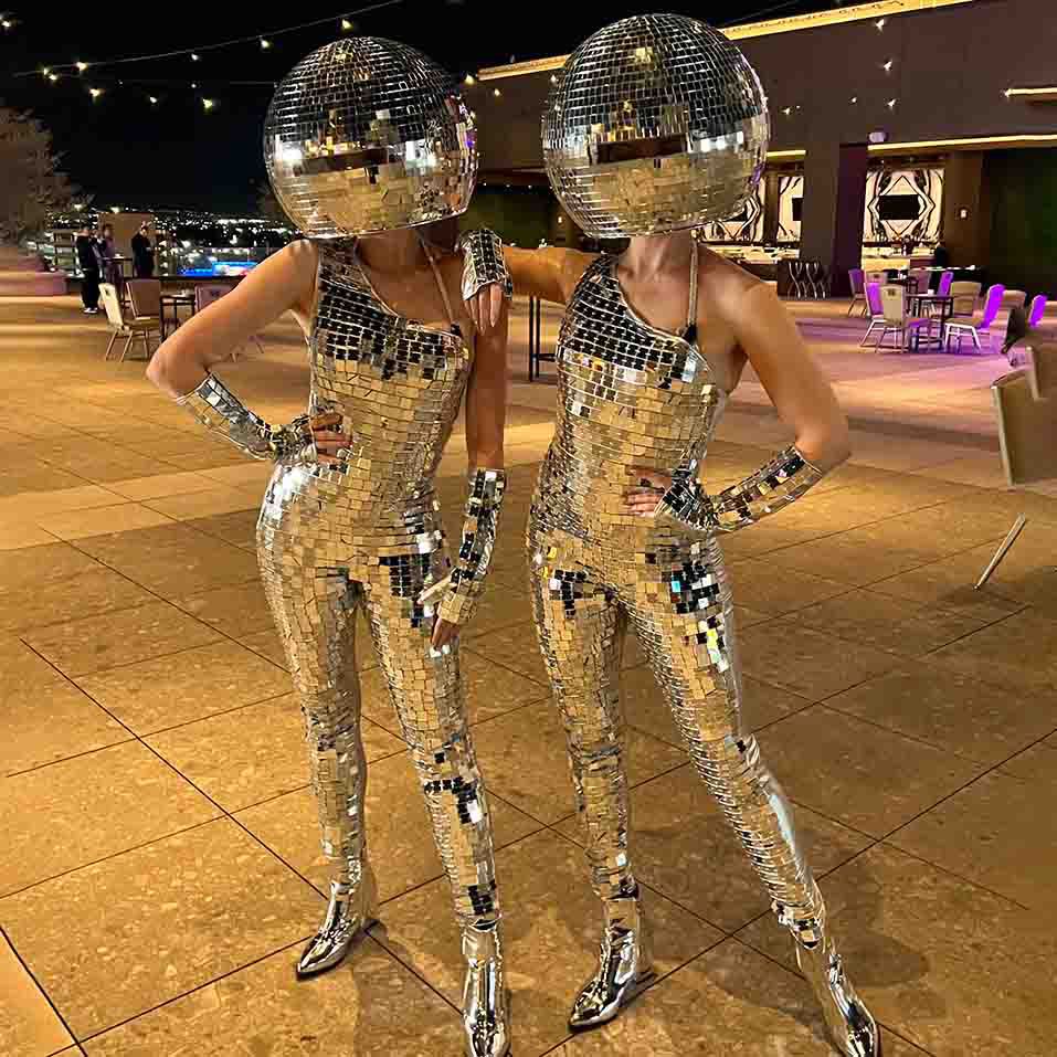 Dazzle guests with our Disco Ball Dancers, dressed up in sparkly attire and topped with an overstated disco ball head