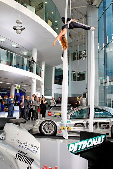 As one of the top aerial acts for hire in the UK and internationally; she tailors her choreography to work perfectly for the event and in synchronisation with DJ Aaron.