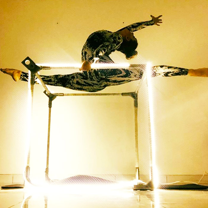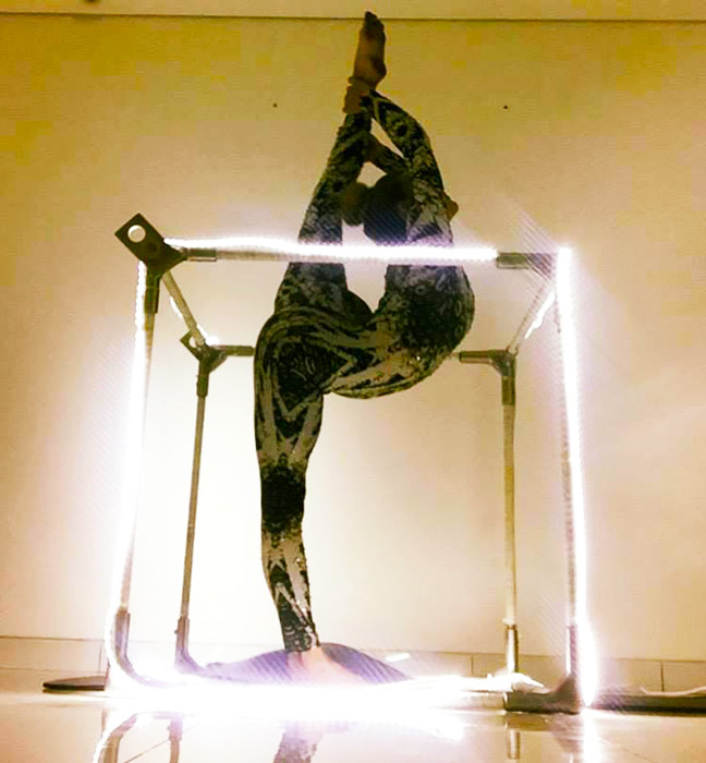 Our multi-disciplined female acrobat and aerialist delivers a variety of exhilarating shows and this acrobatic LED cube act is one of her most unique performances. This act is a fantastic display of acrobatic skills, handstands and contortion shapes with the use of an LED cube that creates a unique visual effect.